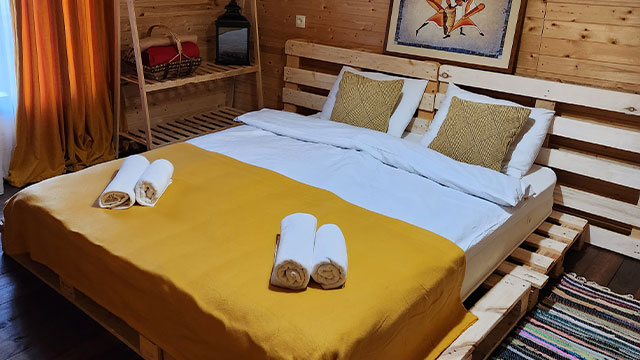 კოტეჯი 2 - არის 2 იზოლირებული საძინებლით, მისაღებში დგას გასაშლელი დივანი და თავსდება 4+1 ადამიანი.